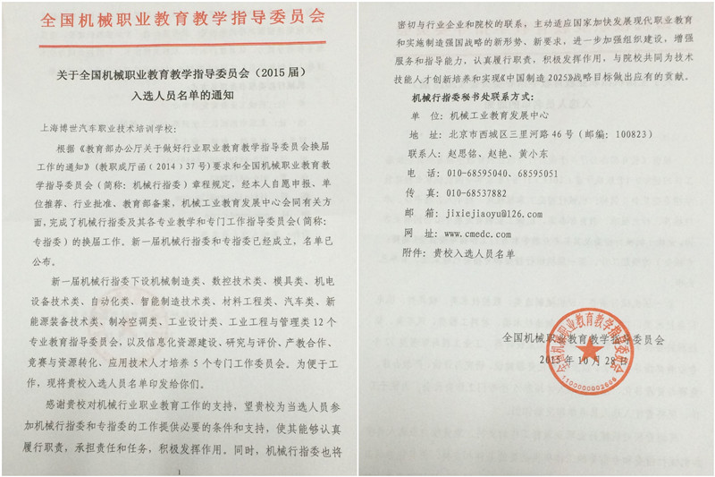 10月16-18日,以“服务《中国制造2025》战略,深化产教融合、校企合作,全面推进机械行业现代职业教育创新实践”为主题的“全国机械职业教育教学指导委员会换届会暨2015年工作会议”在无锡隆重召开。此次会议召开的目的就是为了完成机械行指委及其各专业教学和专门工作指导委员会(简称:专指委)的换届工作。上海博世汽修学校刘勇校长受邀并出席了此次会议。